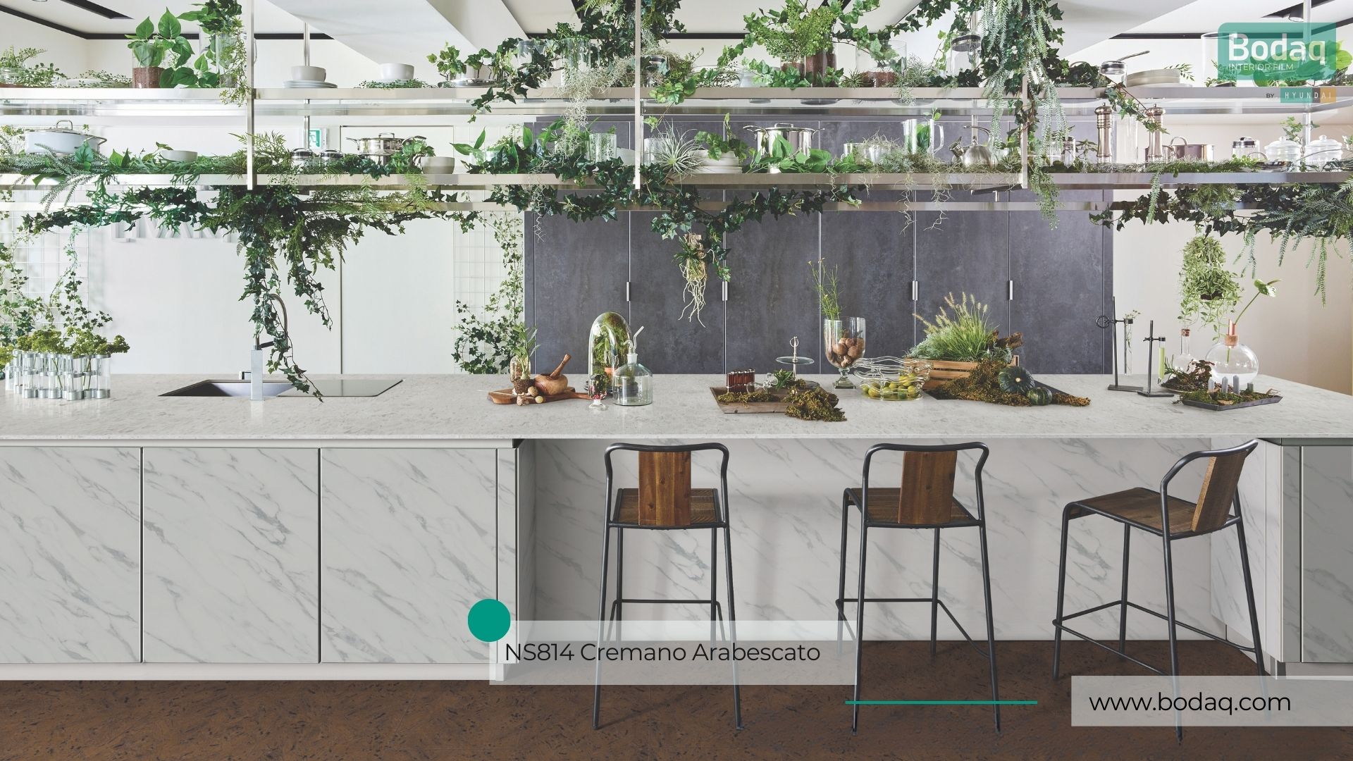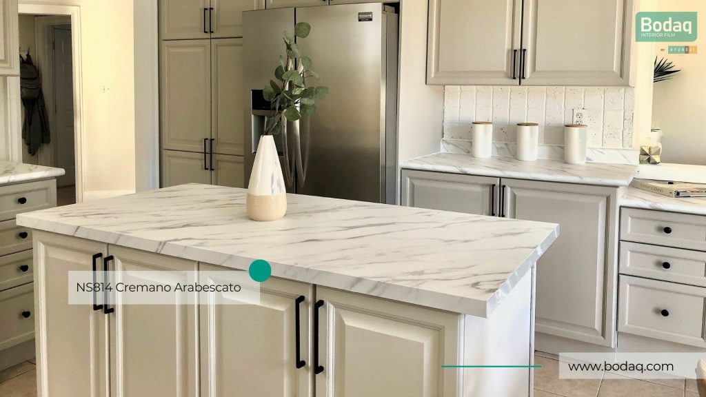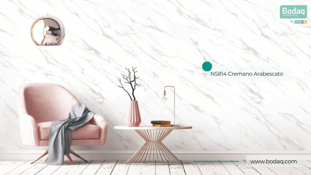 De NS814 Cremano Arabescato interieurfolie heeft een elegante marmertekening met grijze aders op een lichte basis. Een populaire keuze voor luxe interieurs en statement keukens, perfect voor meubels en wandaccenten met een hoogwaardige uitstraling.