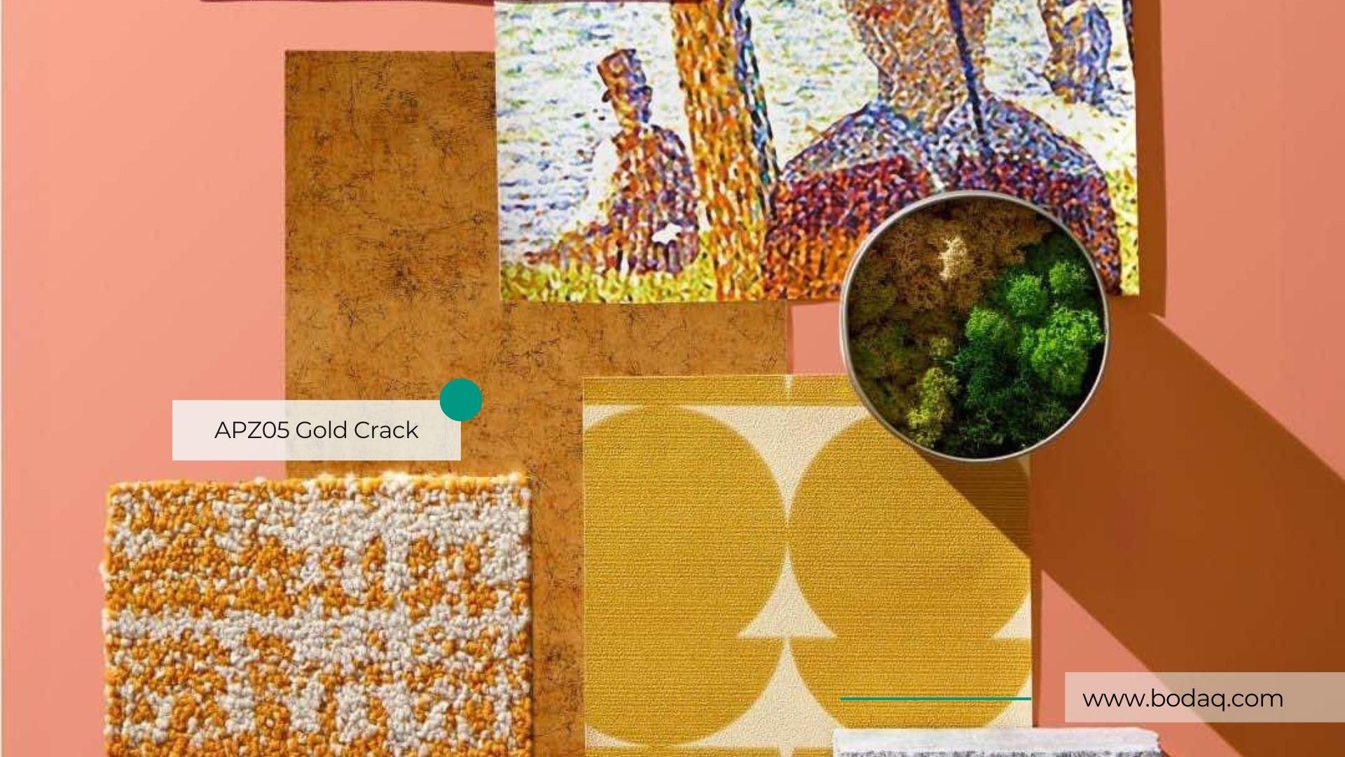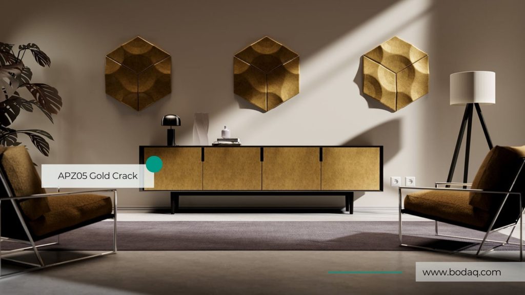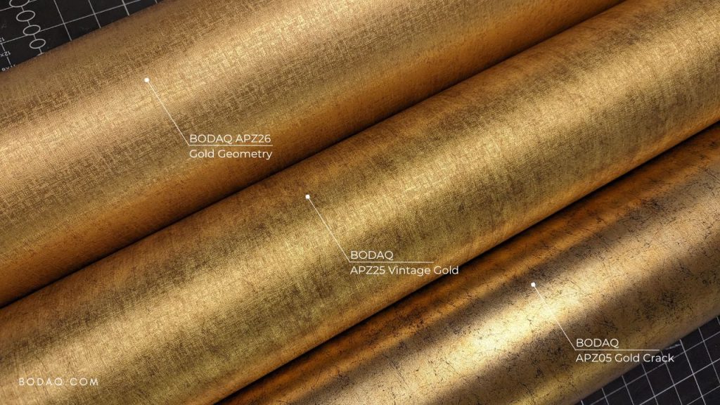 Luxe goudkleurige interieurfolie met craquelé-effect en diepe embossing.