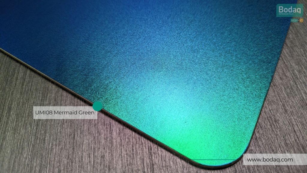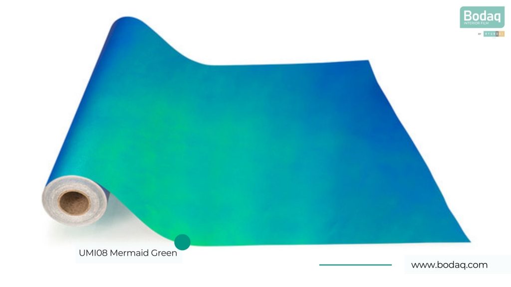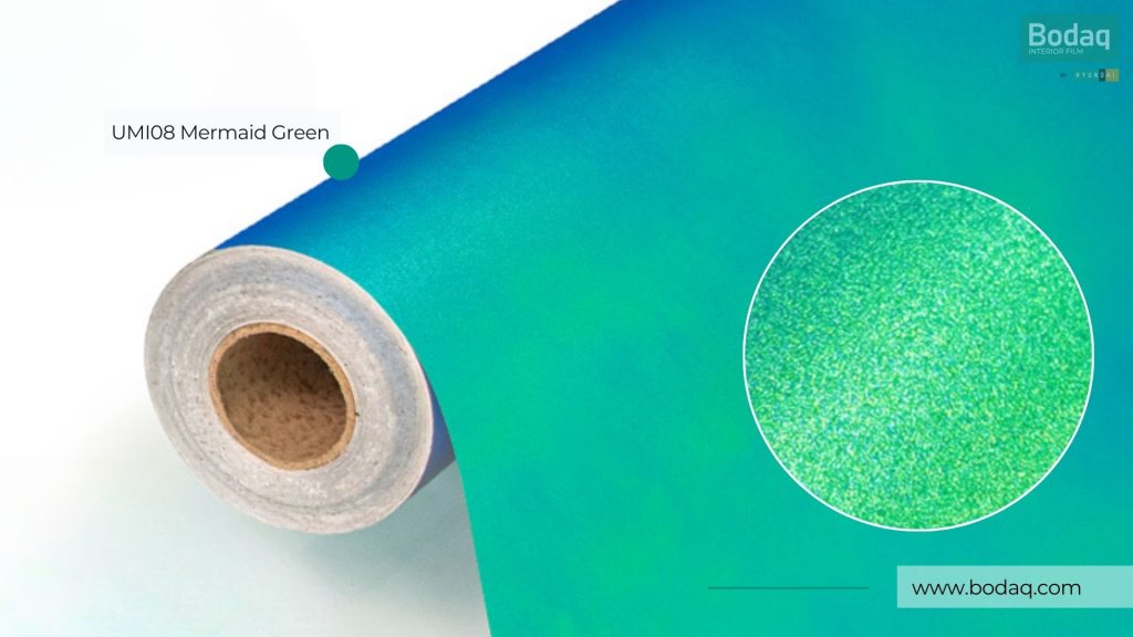 De UMI08 Mermaid Groen Hologram interieurfolie heeft een opvallende groen-metallic basis met holografische schittering. Ideaal voor statement toepassingen, creatieve interieurs, etalages en accentdetails.