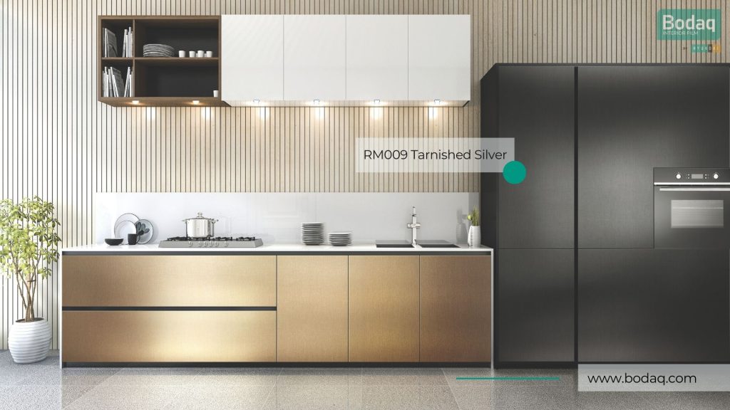 De RM009 Tarnished Silver interieurfolie heeft een verweerde zilverfinish met donkere accenten voor een robuuste, industriële uitstraling. Perfect voor statement meubels en wanden waar je karakter en diepte wilt toevoegen.