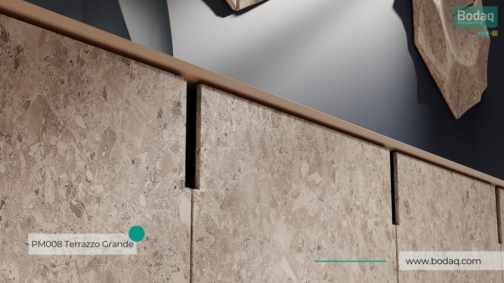 De PM008 Terrazzo Grande interieurfolie heeft een uitgesproken terrazzo patroon met een mix van beige, bruin en grijstinten. Een premium statement design voor moderne interieurs, perfect voor grote oppervlakken zoals keukens, balies, kasten en wanden.