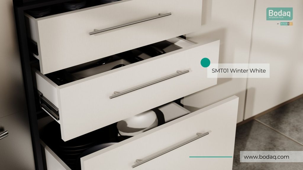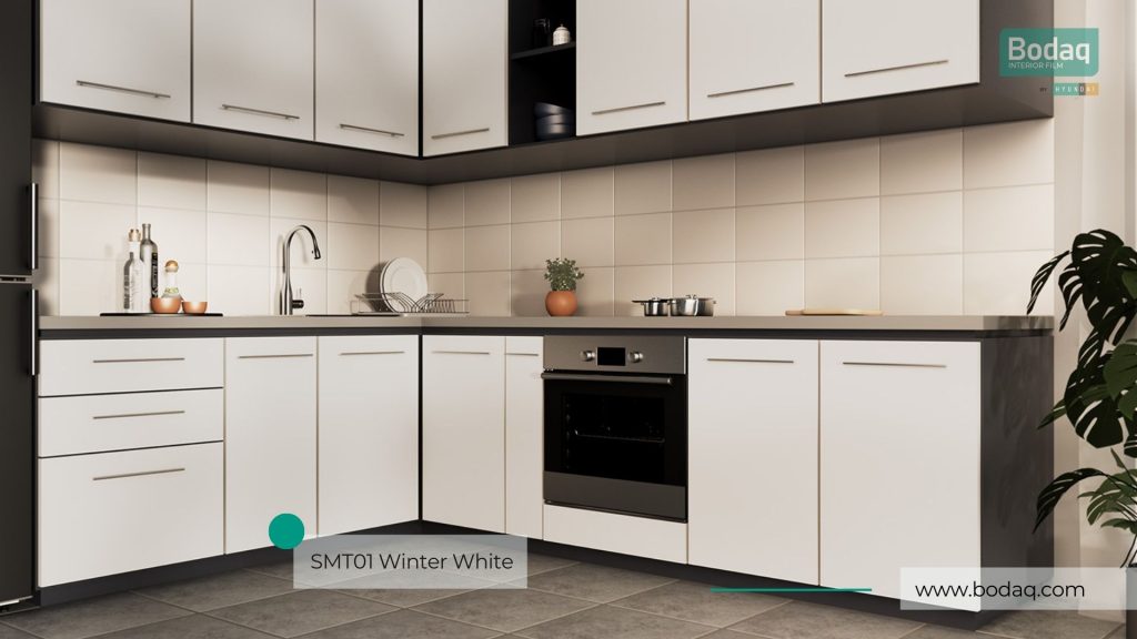 De SMT01 Winter Wit interieurfolie heeft een ultra-matte ‘super mat’ afwerking voor een luxe, moderne look. Door de zeer matte finish oogt het oppervlak rustig en strak—ideaal voor keukenfronten, meubels en wanden.
