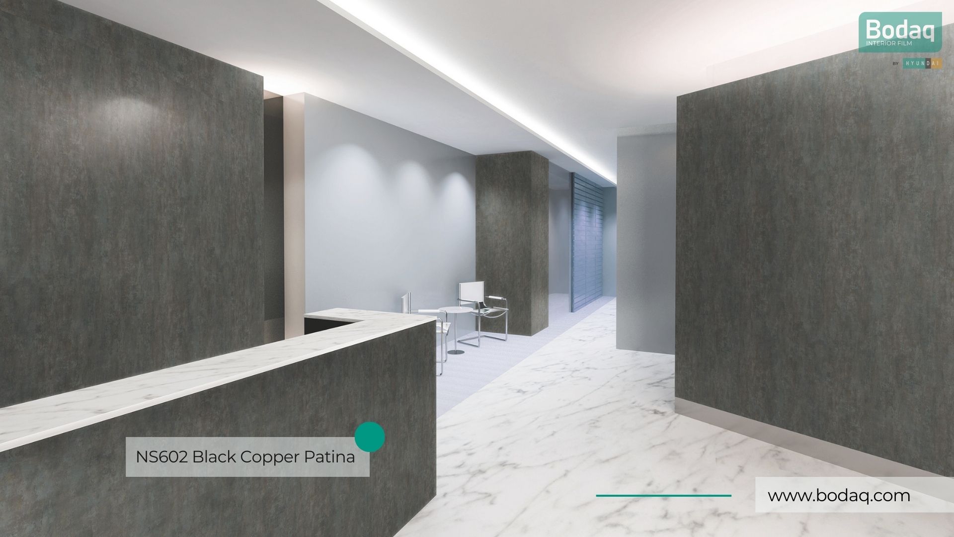 De NS602 Zwart Copper Patina interieurfolie combineert diepe donkere tinten met een realistische koperpatina. Een uitgesproken keuze voor industriële en luxe interieurs.
